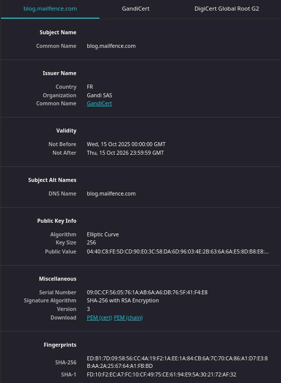 The Mailfence blog SSL/TLS certificate fingerprints/thumbprints (valid until 14/November/2025) are: